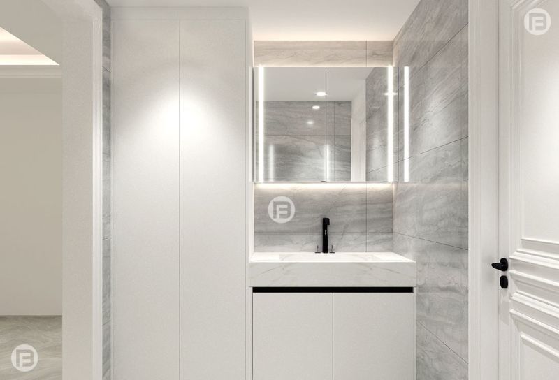 | Vòi nước | Vòi nước màu đen cao cấp, tạo sự tương phản phong cách với đá cẩm thạch trắng và tủ. |