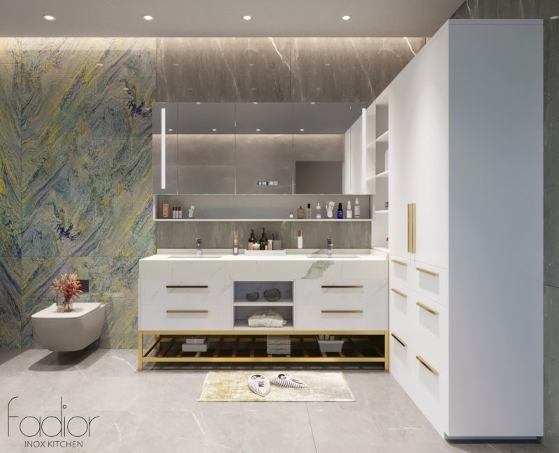 | Q: Đây là The Stainless Steel Bathroom Vanity chủ yếu trang trí hay thực sự sẵn sàng cho dự án? Nó được đọc như dự án sẵn sàng bởi vì trang vẫn liên kết phong cách trở lại với cấu trúc tủ thép không gỉ, mặt bàn thạch anh trắng và quy hoạch thiết bị.Điều đó giữ cho ngôn ngữ thiết kế kết nối với logic thực thi. |