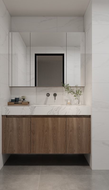 | Q: Tủ phòng tắm vân gỗ mờ hiện đại này có hỗ trợ các thiết bị tích hợp hoặc tính năng hiển thị không? Có. Trang hiện tại đã đề cập đến việc tích hợp thiết bị và kế hoạch lưu trữ/hiển thị có tổ chức, giúp các nhóm mua hàng đánh giá xem ngôn ngữ thiết kế có thể áp dụng cho các khối tủ cao, đảo bếp và các khu vực chức năng hay không. |