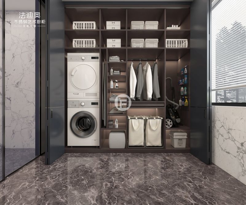Tủ giặt này được trình bày như một hệ thống dựa trên thiết kế chứ không phải là một SKU chung.Nó sử dụng màu xám cùng với cấu trúc tủ thép không gỉ để tạo ra một danh tính trực quan được giải quyết hơn cho các dự án dân cư cao cấp.