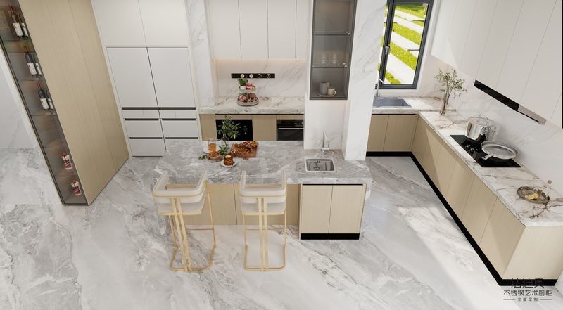 | H: Tại sao tủ bếp hình chữ U bằng thép không gỉ vân gỗ và trắng này lại kết hợp hoàn thiện vân gỗ với cấu trúc thép không gỉ? Giá trị là lớp hoàn thiện vân gỗ mang lại cho dự án một bản sắc hình ảnh ấm áp, mang tính dân cư hơn, trong khi cấu trúc tủ bằng thép không gỉ giúp hệ thống tủ dễ bảo trì và đáng tin cậy hơn cho việc sử dụng lâu dài. |