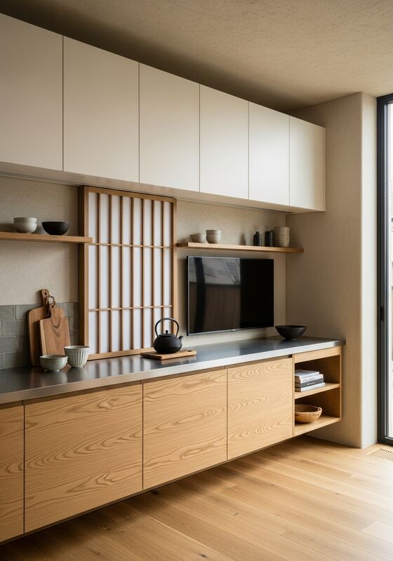 Chủ nghĩa tối giản Japandi hạn chế với chất liệu wabi-sabi ấm áp — gỗ sồi thớ thẳng thống trị, mặt l |